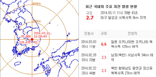 11일 기상청에 따르면, 금일 오전 11시 39분께 대구 달성군 서부서쪽 9km 지역에서 규모 2.7의 지진이 발생했다.