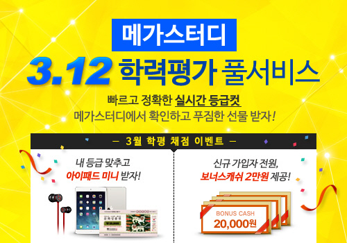 메가스터디(www.megastudy.net, 대표 손주은)에서는 12일부터 3월 고등학생 전국연합학력평가에 대한 실시간 등급컷을 포함한 풀서비스를 무료로 제공하고 있다고 밝혔다.