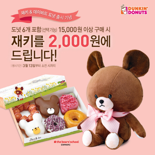 던킨도너츠가 새봄을 맞이해 곰 모양의 캐릭터 재키&데이비드 도넛을 출시하고 귀여운 곰인형 '재키' 프로모션을 마련햇다.
