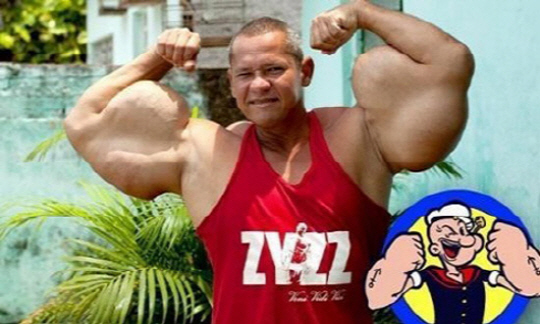 그는 2년 전부터 팔과 어깨 등 근육 여러 군데에 미네랄 오일을 주입하고 운동을 병행해 지금의 뽀빠이 근육을 만드는데 성공했다.