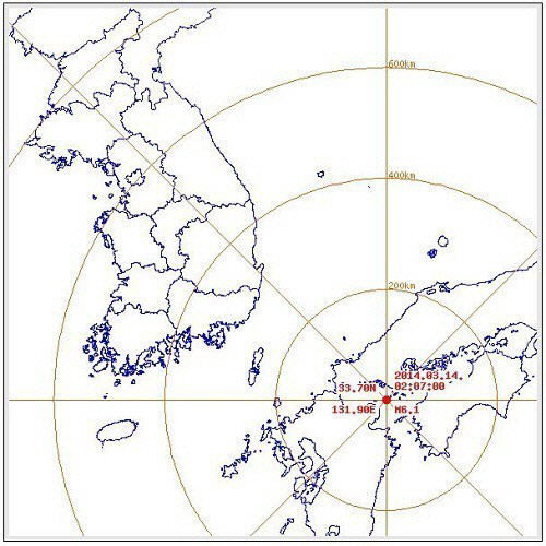 아사히 신문 등 일본 언론들이 기상청 발표를 인용한 보도에 따르면 이날 오전 2시7분쯤 에히메 현에서 진도 5강, 야마구치 현과 오이타 현 등에서 진도 5약의 지진이 관측됐다.