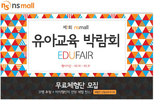 NS몰에서 처음으로 실시하는 '제 1회 유아교육 박람회'는 아이챌린지, 맥포머스, 애플비, 천재교육 등 20개 이상의 교육 전문 브랜드가 참가한다. 유아기부터 초등학교까지 다양한 교재와 교구, 문구, 장난감 등 상품이 구비되어 있으며 최고 30%까지 할인된다.