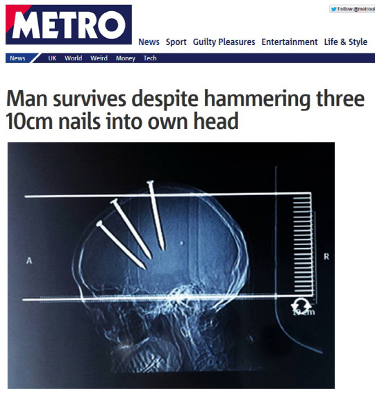 대형 못 3개가 머리에 박히고도 기적적으로 생존한 남성의 소식이 전해졌다.