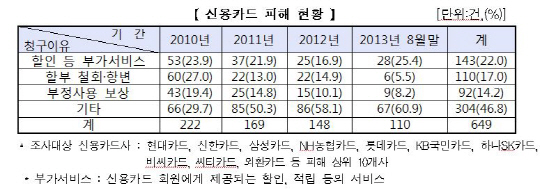 한국소비자원은 17일 "2010년 1월부터 2013년 8월까지 접수된 신용카드 관련 피해사례를 분석한 결과(10개 신용카드사) 신용카드 사용시 할인 혜택에 대한 소비자 불만이 가장 많은 것으로 조사됐다"고 밝혔다.