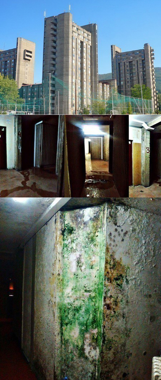 공개된 사진은 마케도니아의 수도 스코페에 위치한 기숙사로, 깔끔해 보이는 외관과 달리 시멘트가 그대로 드러나 있거나 바닥에 곰팡이가 가득한 내부의 모습이 담겨있다.