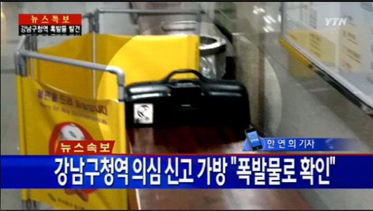 경찰 등에 따르면 이날 오후 2시 5분 강남구청역의 강남구청에서 왕십리방향 열차 승강장에서 여행용 가방이 발견됐다는 신고가 접수돼 경찰특공대가 출동해 조사한 결과 폭발물로 확인됐다.