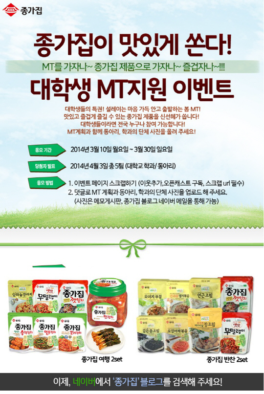 응모 기간은 오는 30일(일)까지며, 응모방법은 종가집 블로그(http://blog.naver.com/chefzzong_)내 이벤트 페이지를 스크랩한 후 MT 계획과 동아리나 학과의 단체사진을 업로드 하면 된다. 추첨을 통해 5팀을 선정, 종가집 여행 세트와 반찬 세트를 각 2세트씩 제공하며 당첨자는 4월 3일(목)에 발표한다.