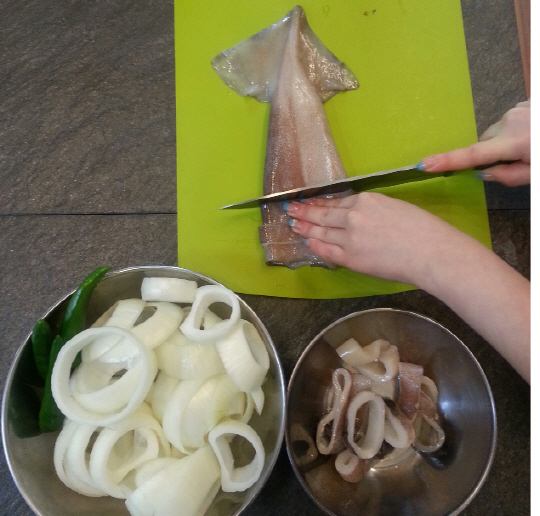 평소 귀찮아서 자주 해먹지 못하던 오징어 튀김에 도전해봤다. 일단 오징어는 내장을 빼고 잘 손질해 링 형태로 잘라 준비한다. 양파도 안에 심을 빼고 링 형태로 준비! 빵가루, 튀김가루, 계란은 그릇에 깔끔하게 준비해주면 된다.