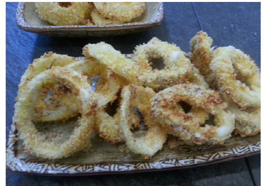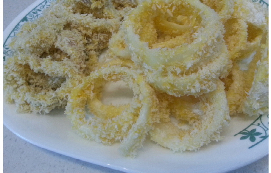 링형태로 준비한 오징어 양파에 튀김가루 계란 빵가루등을 묻힌다.