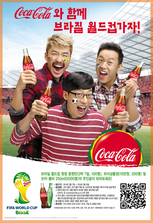 코카-콜라는 18일 "브라질월드컵 축제의 현장에 직접 참석해 대한민국 국가대표팀을 응원할 코카-콜라 응원단 100명, 외식 상품권 200명, 코카-콜라 250ml 모바일 쿠폰 5000명 등을 경품으로 지급하는 '코카-콜라와 함께 브라질 월드컵 가자' 프로모션을 5월 16일까지 진행한다"고 밝혔다.