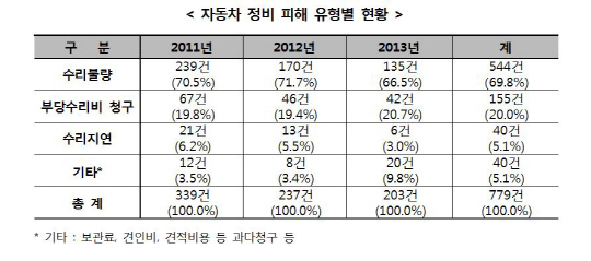 특히 정비업체의 '수리불량'으로 인한 피해가 544건(69.8%)으로 가장 많았고 이어 '부당수리비 청구' 155건(20.0%), '수리지연' 40건(5.1%) 등으로 나타났다.
