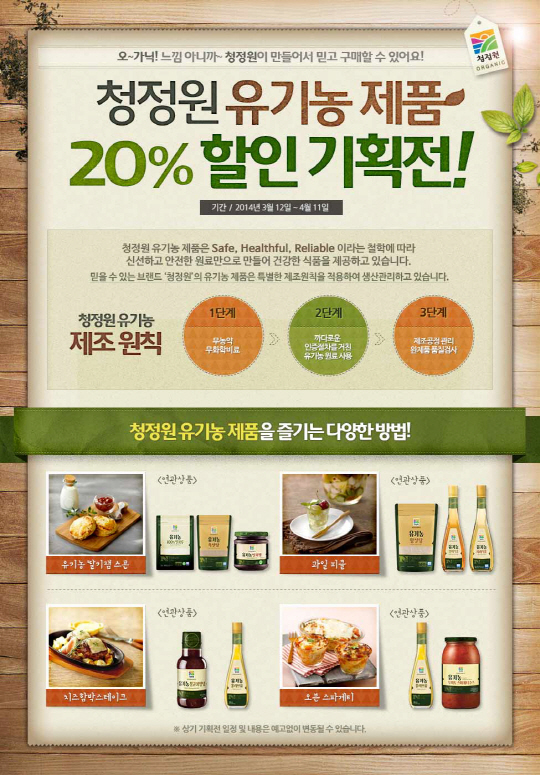 대상 통합온라인몰 정원e샵(www.jungoneshop.com)에서는 오는 4월 11일까지 '청정원 유기농 제품 할인기획전'을 진행한다.