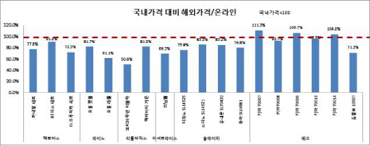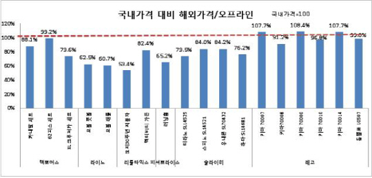 물론 저렴한 제품도 있었다. 온라인 쇼핑몰을 기준으로 키마 '이글로의 트윈바이크'(-10.1%), 키마 '고르잔의 고릴라스트라이커'(-6.3%), 키마 '악어늪지 은신처'(-3.9%) 등 레고의 3개 제품은 국내 온라인 가격이 외국 온라인 쇼핑몰보다 더 저렴했다.