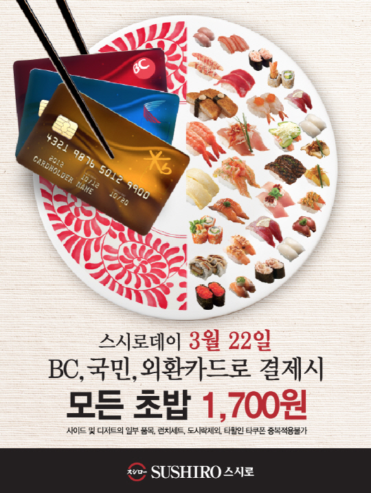 세계 최대의 회전초밥 레스토랑 스시로한국(대표 최세철)이 22일 스시로데이를 맞아 국민, 비씨, 외환카드로 결제하는 고객들에게 모든 메뉴를 1700원 균일가 판매 행사를 진행한다.