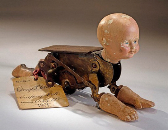 처키의 조상 인형 정식 이름은 '자연스럽게 기는 아기 인형'으로 태엽을 감으면 아기가 양 팔과 다리를 사용해 바닥을 기어간다. 이 인형은 조지 펨버튼 클라크가 1871년 8월 특허를 받은 장난감으로 알려졌다.
