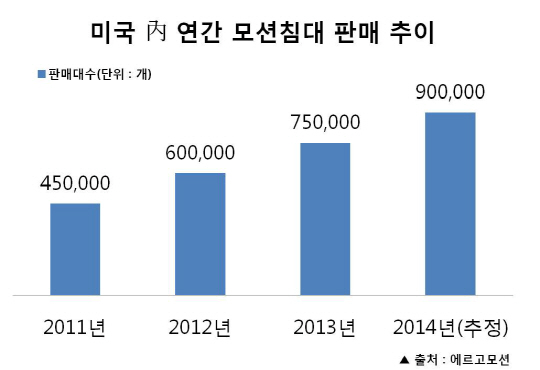 최근 기능성 침대 중 각도 조절 기능을 가진 '모션침대'는 침대 문화의 원조 격인 미국과 유럽에서 인기를 얻고 있다. 편안한 잠자리를 갈망하는 웰슬리핑(well-sleeping)족이 늘어나면서 다양한 기능으로 숙면을 도우며 휴식공간의 역할까지 톡톡히 해내는 기능성 침대가 오랫동안 침실을 차지해왔던 스프링 매트리스를 대체하고 있는 것. 실제로 이런 흐름을 주도하고 있는 미국의 대표적인 모션침대 에르고모션 관계자에 따르면 미국 모션침대 시장 규모는 최근 3년간 매해 20%를 웃도는 성장세를 보이고 있다. (표 참조)