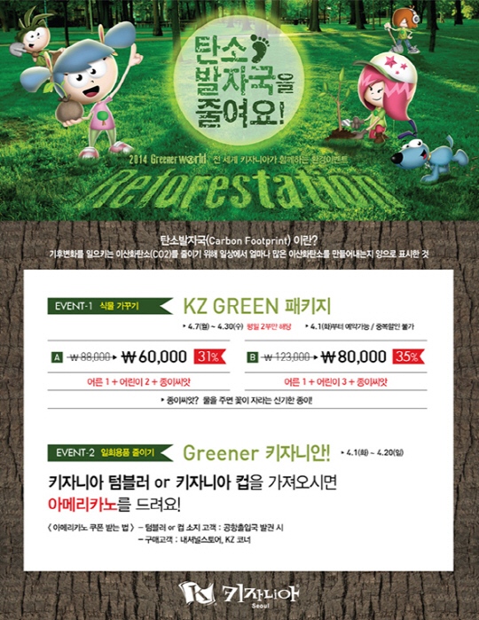 '탄소발자국을 줄여요' 캠페인의 실천 4계명을 컨셉으로 한 식물존도 조성될 예정이다. 키자니아 서울은 키자니아 캐릭터의 성격과 개성에 따라 꾸며질 '키자니아 숲'은 4월 4일부터 중앙광장에서 만나볼 수 있다.