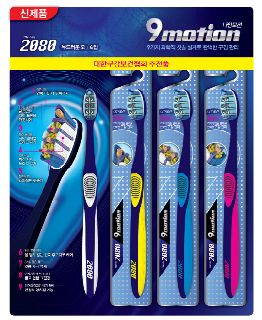 신상품 2080 나인모션 칫솔은 치아 표면에 맞춘 과학적인 식모 방식과 인체공학적 칫솔대 설계 등 9가지의 과학적 설계로 치아 구석구석에 자리잡은 치석을 효과적으로 관리해주는 게 특징이다. 치아를 고려한 입체적인 3D 칫솔모 디자인을 통해 평소 관리가 어려운 어금니의 전방위적인 치석제거는 물론 칫솔이 잘 닿지 않는 치아 뒤쪽까지 관리할 수 있다. 2080 나인모션 칫솔은 일반 칫솔과 달리 칫솔모의 고유한 배열 방식으로 기능성을 높였다. 칫솔 중앙에 배열된 원형모의 경우 4가지 방향으로 움직일 수 있어 치아 측면에 숨어있는 프라그까지 관리가 가능하다. 칫솔모 윗부분은 8도 가량 기울어져 있어 어금니 뒤쪽의 치석까지 효과적으로 제거할 수 있다.