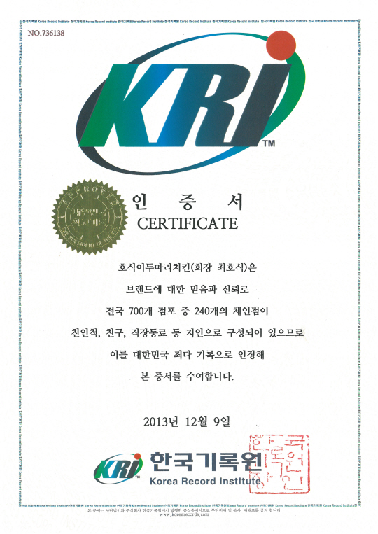 최호식 대표는 "고객 감동 실천만이 프랜차이즈로 살아남을 수 있는 방법이며 점주 우선 경영이 자리 잡아야 어지러운 프랜차이즈 시장 질서가 바로 잡아지기 때문에 우리부터 몸소 실천하고 있다"고 말했다.