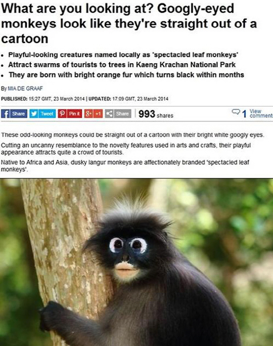 최근 영국 데일리메일은 동남아 태국 페차부리에 위치한 국립공원에 사는 더스키 랑구르 원숭이(일명 안경 원숭이)를 소개했다.