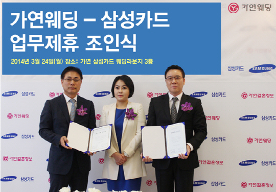 가연웨딩㈜와 삼성카드㈜가 24일 역삼동 가연결혼정보·가연웨딩 사옥 가연타워에서 업무제휴 조인식을 가졌다.