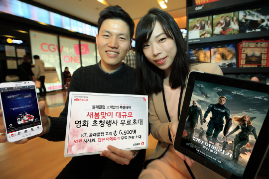 KT는 6500명의 고객 대상 대규모 영화 초청 이벤트인 'Thanks Together olleh club' 행사를 서울과 부산에서 진행한다. 영화 '역린'은 4000명, '캡틴 아메리카:윈터솔져' 2500명이 무료로 관람할 수 있다.