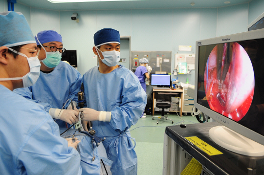 ◇남도현 신경외과 교수(사진 가운데)와 홍상덕 이비인후과 교수(사진 오른쪽)이 뇌종양 내시경 수술을 진행하고 있다.