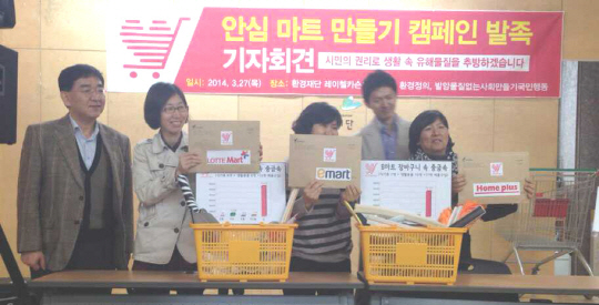 한편, 환경시민단체로 구성된 '발암물질 없는 사회 만들기 공동행동'은 이날 중구 환경재단 레이첼카슨 홀에서 '안심마트 만들기' 캠페인 발족 기자회견을 열고 제품에 함유된 화학물질 자료를 소비자에게 제공할 것을 대형마트 측에 촉구했다.