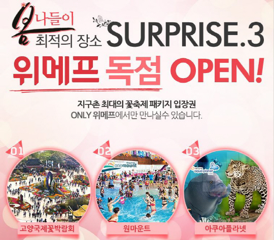 위메프에서 판매되는 상품은 '고양 국제 꽃 박람회' 입장권과 '일산 아쿠아플라넷' 입장권을 엮은 입장권 패키지와 '고양 국제 꽃 박람회' 입장권과 원마운트의 워터파크 또는 스노우파크 이용권을 엮은 패키지 2가지로 구성돼 있다.