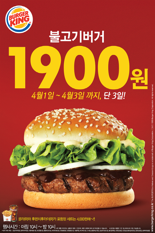 버거킹 "4월1∼3일 불고기버거 1900원에 드립니다"