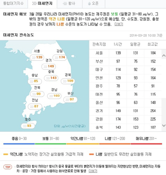 현재 미세먼지 농도, 환경오염 때문에 먼지도 많아지네", "