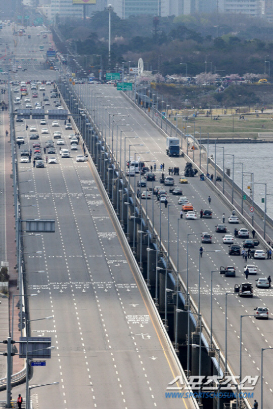 | 30일 '어벤져스2' 촬영 중인 마포대교 일대 정경 |