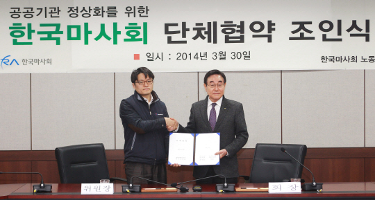 KRA 한국마사회 현명관 회장과 장경민 노조위원장이 30일 오전 11시 한국마사회 본관 대강당에서 정상화 합의서에 서명했다. 한국마사회는 지난해 말 '방만경영 중점관리 대상기관'에 선정된 바 있다.