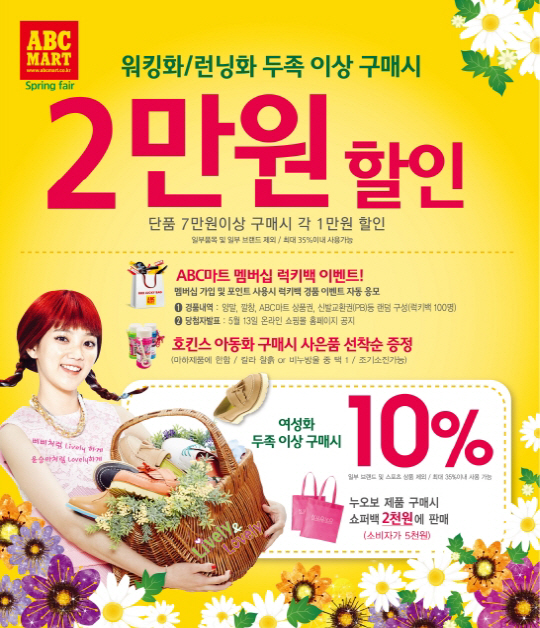 이벤트는 4월 27일까지 진행되며, 행사 기간 동안 ABC마트의 레이디스 캐쥬얼 여성화 2켤레를 구매하는 모든 고객에게 구매 금액 10%를 할인해준다. 또 배우 윤승아가 모델로 활약 중인 누오보(NUOVO) 제품을 구매하는 전 고객에겐 현재 5000원에 판매 중인 패션 부직포 백을 2000원에 판매한다.