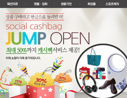 최근 판매자와 구매자 모두에게 큰 만족감을 줄 수 있는 새로운 서비스인 소셜 캐시백 '점프'가 등장해 눈길을 끌고 있다. 판매자 입장에서는 국내 시장과 해외 시장에 상품을 판매하는데 시장 가격을 전혀 흐리지 않고 상품을 판매하면서 입소문마케팅 효과까지 얻을 수 있다. 구매자 입장에서는 상품을 온라인상에서 가장 싸게 구입하고도 최대 50%까지 추가적인 캐시백 서비스를 제공받을 수 있고, 1만원 이상은 현금화 할 수 있어 쇼핑 만족도를 한층 높여 주는 서비스다.