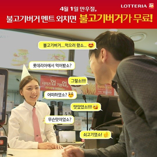 롯데리아는 만우절인 1일 오후 2시부터 매장에 방문한 고객이 "불고기버거 먹으러 왔소"를 외친 후 점원과 지정된 대화를 주고받으면 불고기버거를 무료로 증정하는 행사를 진행하고 있다.