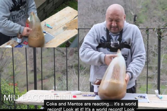 유튜브에 올라온 영상을 보면 이탈리아의 한 과학자가 1.5리터 짜리 콜라병 입구에 누텔라 브랜드의 초코잼을 바른다. 이어 멘토스 5개 정도 들어있는 콘돔으로 콜라 병 입구를 막아 테이프로 봉했다. 손으로 병 입구를 잡은 뒤 멘토스를 하나씩 넣자 콜라가 부글부글 끓으면서 금새 콘돔을 부풀렸다.