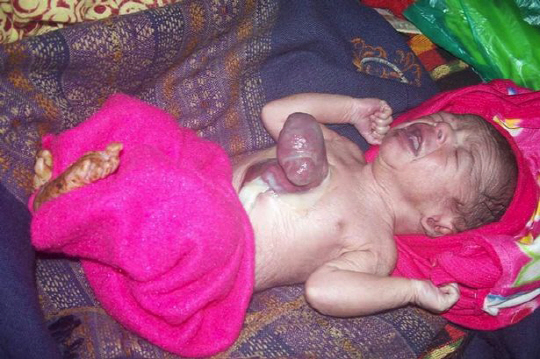 심장이 가슴 밖으로 나와있는 아이가 태어나 충격을 주고 있다.
