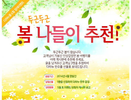 한우전문쇼핑몰 다하누몰(www.dahanoomall.com 대표 최계경)에서는 4월의 시작과 함께 찾아온 완연한 봄나들이 시즌을 맞아 고객 참여 댓글 이벤트를 준비했다.