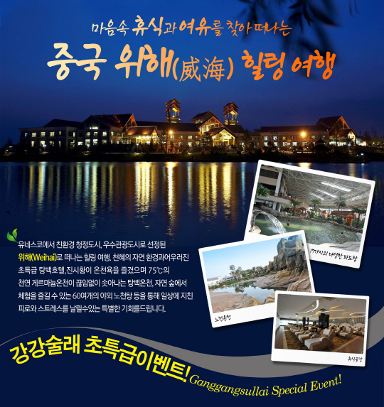 외식문화기업 '강강술래'는 이달 30일까지 홈페이지(www.sullai.com) 경품 이벤트를 통해 중국 위해 탕백온천호텔 2박3일 숙박권을 선물로 내놨다.