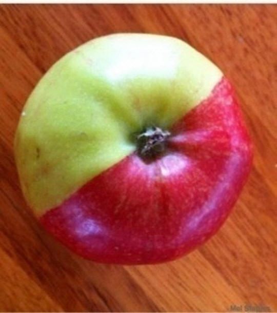 공개된 사진에는 반은 초록, 나머지 반은 빨강인 보고도 믿지 못할 사과의 모습이 담겨져 있다.