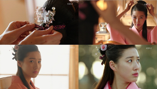정태와 수줍게 감정을 싹틔워가던 가야는 자신의 아버지를 죽인 원수 영출과 원수의 아들이 되어버린 정태에게 복수하기 위해 일국회에 입단을 결심하고 신이치의 뒤를 따르기로 한다. 이러한 가야 캐릭터의 확연한 변화를 가야의 선머슴 같은 모습에서 분홍색의 기모노를 입고 가야 스스로 화려한 꽃모양의 머리 장신구를 착용하며 단장하는 장면을 통하여 대비적으로 보여주었다. 캐릭터 변화를 예고하는 장면인 만큼 분홍빛의 자개를 깎아 제작한 벚꽃 모양의 머리 뒷장식과 크고 작은 꽃들을 디자인한 자개 머리꽂이를 오른쪽과 왼쪽에 통일감 있게 착용하여 가야의 아름다운 여성미가 잘 드러날 수 있도록 하였다.