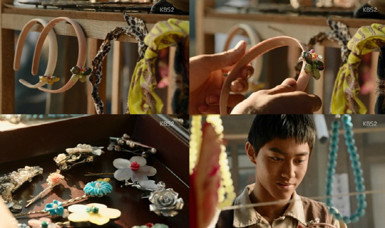 사랑하는 여동생 청아를 위해 산 선물은 연한 분홍색의 머리띠로 은은한 노란빛의 나비가 포인트로 들어간 제품이다. 어린 청아의 귀여운 소녀 이미지를 살리고자 연한 분홍색의 바탕에 나비를 은은한 노란빛의 자개로 깎아 디자인하였다. 가야에게 선물하기 위해 고른 것은 분홍색의 장미 모양 머리핀으로 소박하지만 정태의 가야를 향한 애틋한 마음이 드러날 수 있게 아기자기한 비즈로 포인트를 주어 디자인한 작품이다.