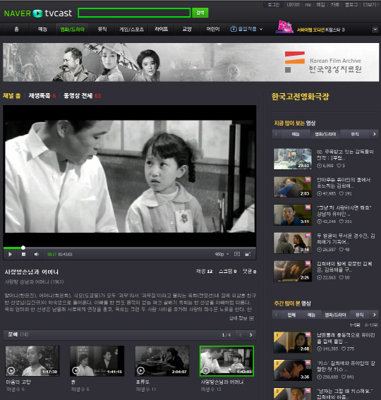 네이버(대표이사 사장 김상헌)가 한국영상자료원(원장 이병훈)과 제휴를 맺고, 3일부터 네이버 동영상서비스 TV캐스트를 통해 한국고전영화를 소개하는 '한국고전영화극장' 채널을 신설한다.