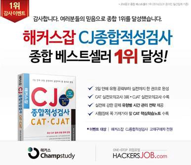 CJ가 지난달 31일 상반기 공채 서류전형 합격자를 발표함에 따라, CJ 취업을 준비하는 수험생의 수요가 몰려 해커스잡의 'CJ 종합적성검사 CAT CJAT' 교재가 다음날인 4월 1일 인터넷 교보문고 베스트셀러 1위에 올랐다. 취업 /수험서가 종합 1위에 오른 것은 인터넷 교보문고 사상 최초로 취업준비생들의 대기업 인적성에 대한 높은 수요를 상징적으로 보여주는 것으로 분석된다.