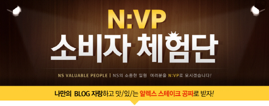 체험단은 23일부터 5월 2일까지 10일간 활동하며 '알렉스 스테이크'를 체험하고 후기를 전하면 된다. 오는 7일부터 18일까지 N:VP 소비자체험단 응모 게시판에 현재 운영중인 블로그 주소(URL)와 간단한 신청사연을 작성하면 모집이 완료된다. 당첨 결과는 오는 21일 이벤트 게시판 또는 이메일로 개별 확인할 수 있다.
