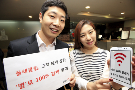 KT(회장 황창규)가 올레클럽 회원을 대상으로 올레 WiFi를 단기간 이용할 수 있는 '올레 WiFi 플래시' 상품도 '별'로 100% 할인(별차감) 가능하게 하고, 카페거리 50% 할인 행사를 6월 말까지 연장 진행한다.