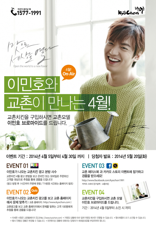 교촌에프앤비가 2014년 교촌치킨의 새 모델로 인기배우 이민호를 발탁한 것은 기념해 특별 이벤트를 마련했다.