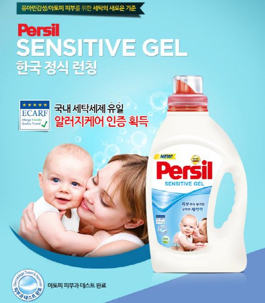 신제품 퍼실 센서티브젤은 유아 민감성피부나 아토피 피부에 사용해도 적합할 정도로 순하면서도 강력한 세정력을 갖춘 액체세제로 국내 세탁세제 중 유일하게 알러지케어 인증을 획득했다.