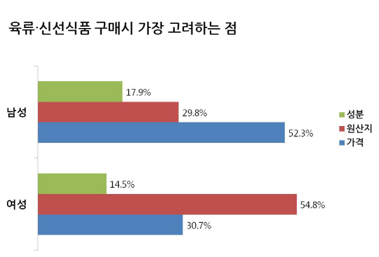 육류나 신선식품을 구매할 때 남성은 '가격'을, 여성은 '원산지'를 제일 먼저 살펴보는 것으로 조사됐다.